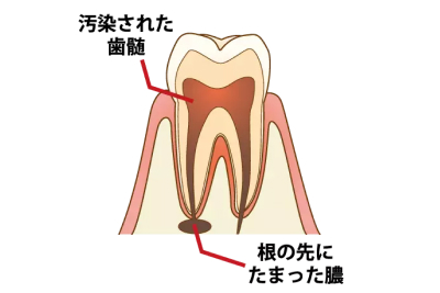 根管治療とは、歯の根っこ(歯根)にひそむ虫歯菌や細菌を特殊な器具を使って除去する治療方法です。主に、歯の神経(歯髄)がおかされた虫歯の治療で根管治療を行います。