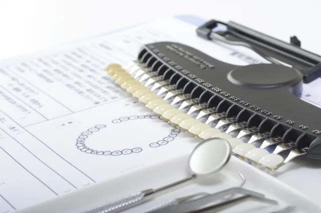 色見本を使って、現在の歯の色と目標とする歯の白さを患者様と共有しながら進めていきます。施術の追加が必要かどうか、施術前後のお口のケアやアフターフォローにもしっかり対応しますので、どのようなことでもご相談ください。